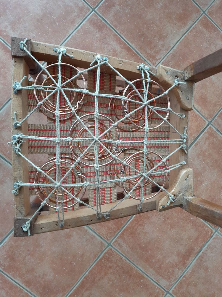 Danach bildet die Gurtung wieder ein stabiles Fundament für die Schnürung der Federn. Die einzelnen Federn werden auf die Gurte aufgenäht und mit Hanfschnürfäden in die gewünschte Form gebracht.
